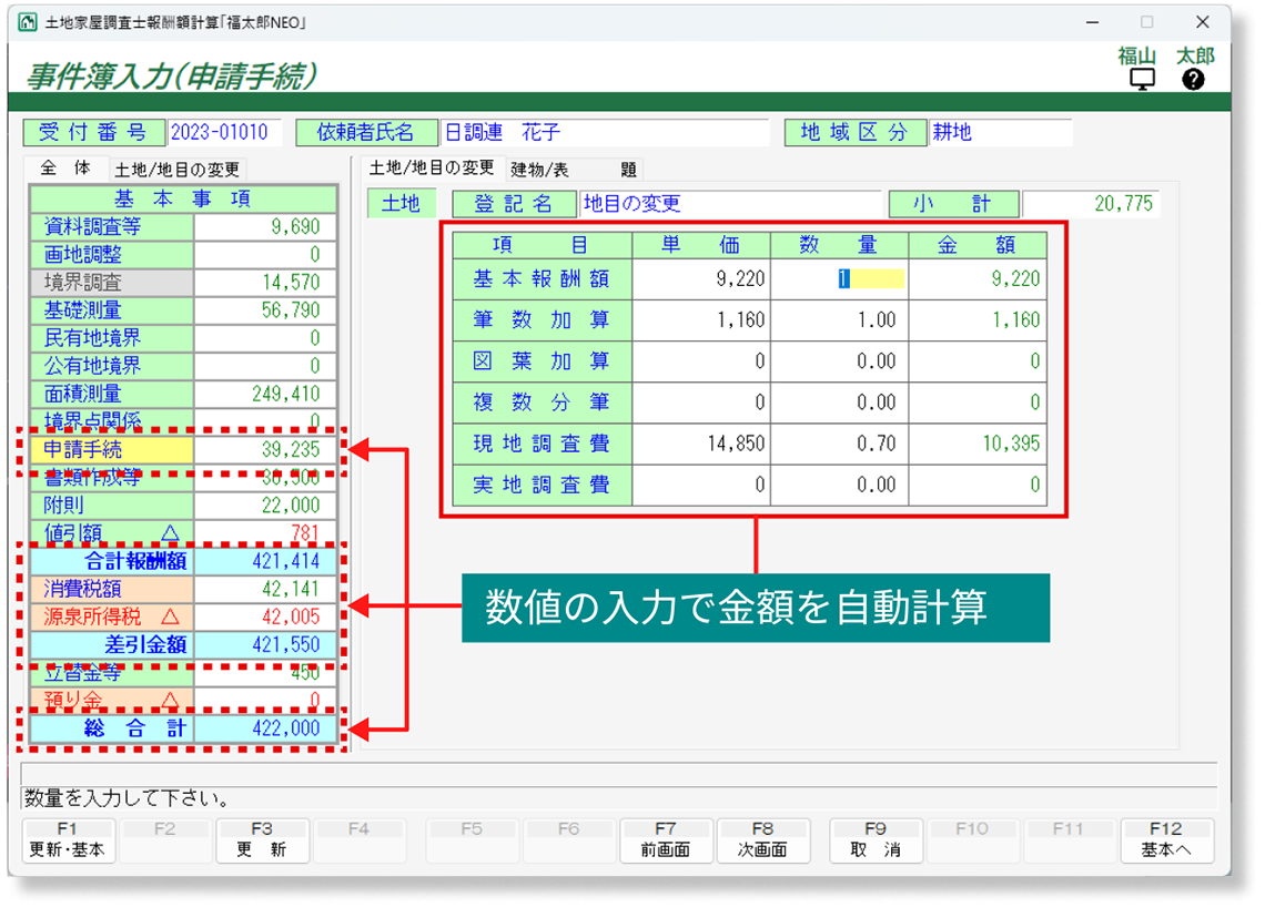 福太郎NEOは、土地家屋調査士様の報酬額計算書や請求書等の作成をサポートするソフトウェアです。