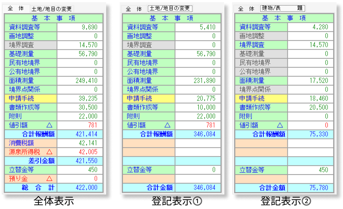 自動計算される各業務の金額や消費税額及び合計額は、「全体の金額」または「個別の金額」のいずれかの表示に切り替えられます。