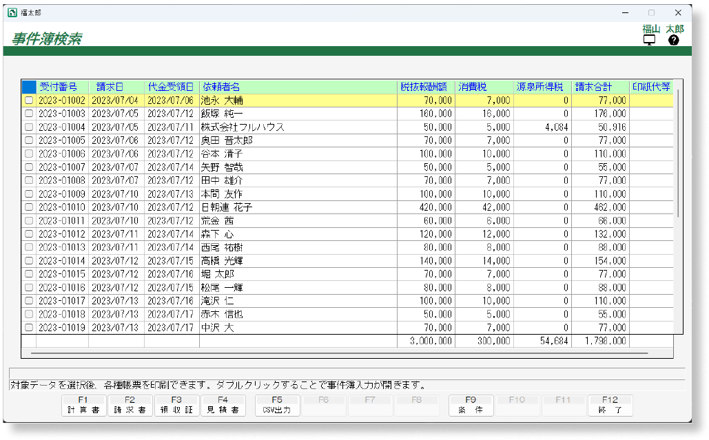 表示された事件簿を複数選択し、報酬額計算書や請求書を一括で印刷できます。