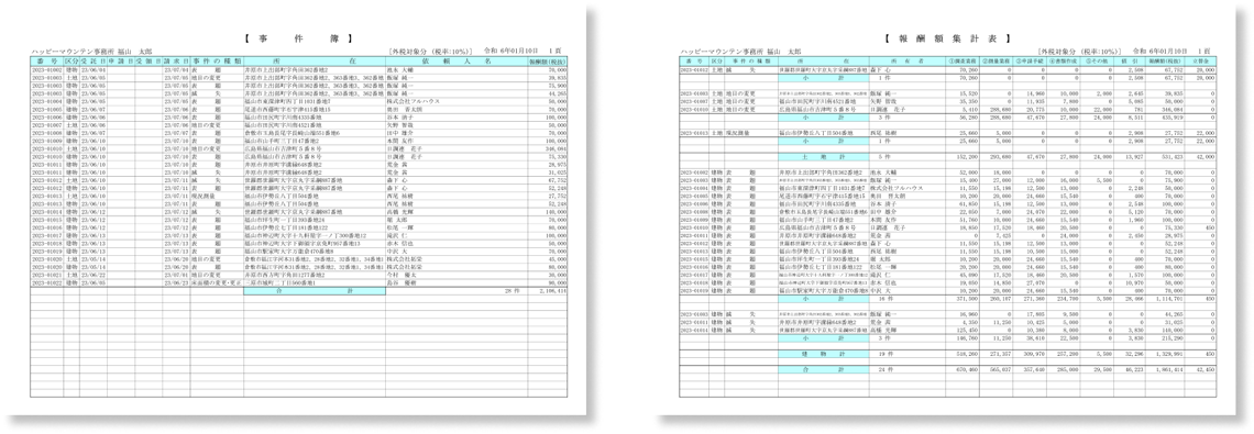 事件ごとの報酬額を確認できる事件簿一覧や、業務ごとの金額を確認できる報酬額集計表など、複数の一覧表を出力できます。